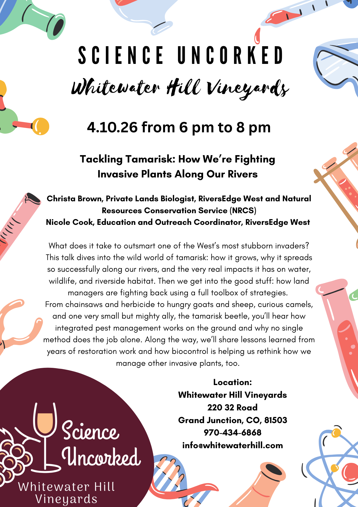Join us at Whitewater Hill Vineyards for our Science Uncorked talk, Tackling Tamarisk!