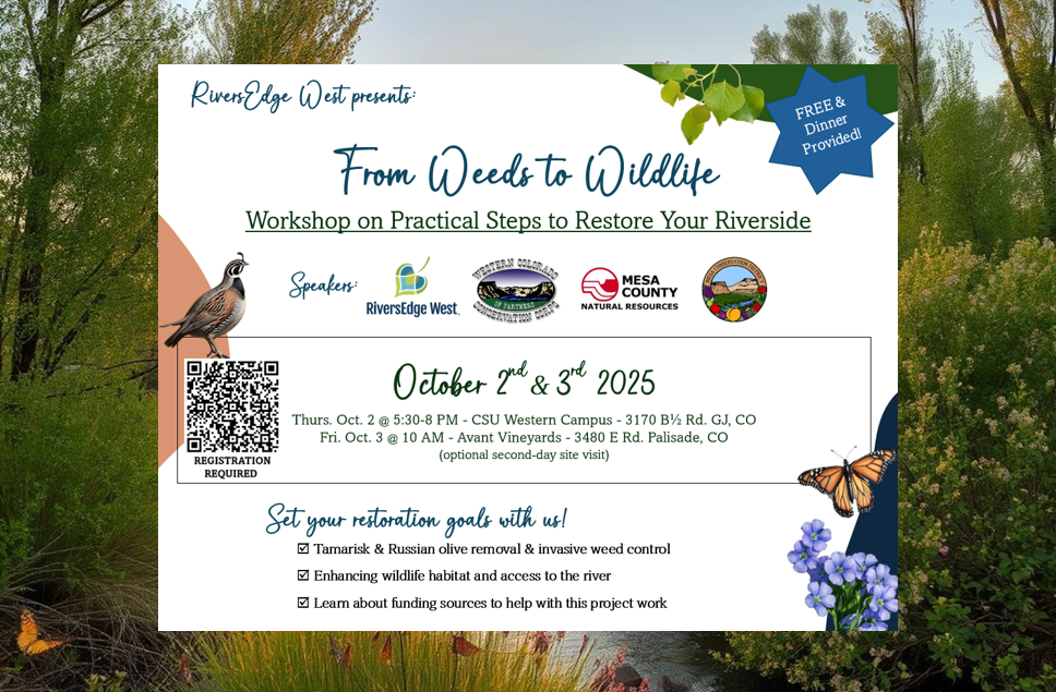 This workshop is open to private landowners, land managers, farmers, partners, and anyone else interested in learning more about this. We will have 3 guest speakers in addition to RiversEdge West’s presentation: Mesa Conservation District, Mesa County Noxious Weed & Pest Management, and Western Colorado Conservation Corps.